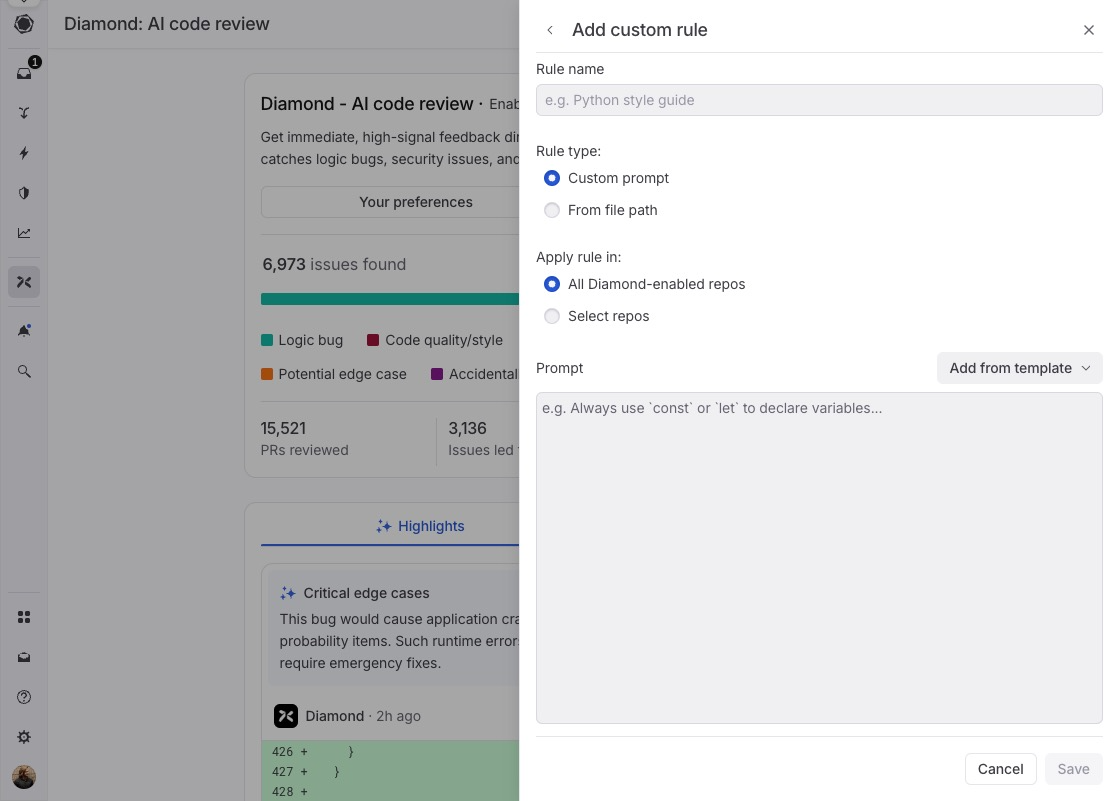 Custom rules allow you to define explicit guidelines for Diamond to follow when reviewing your code. This is especially powerful for enforcing team-specific best practices. With custom rules, you can:- Define coding standards specific to your codebase