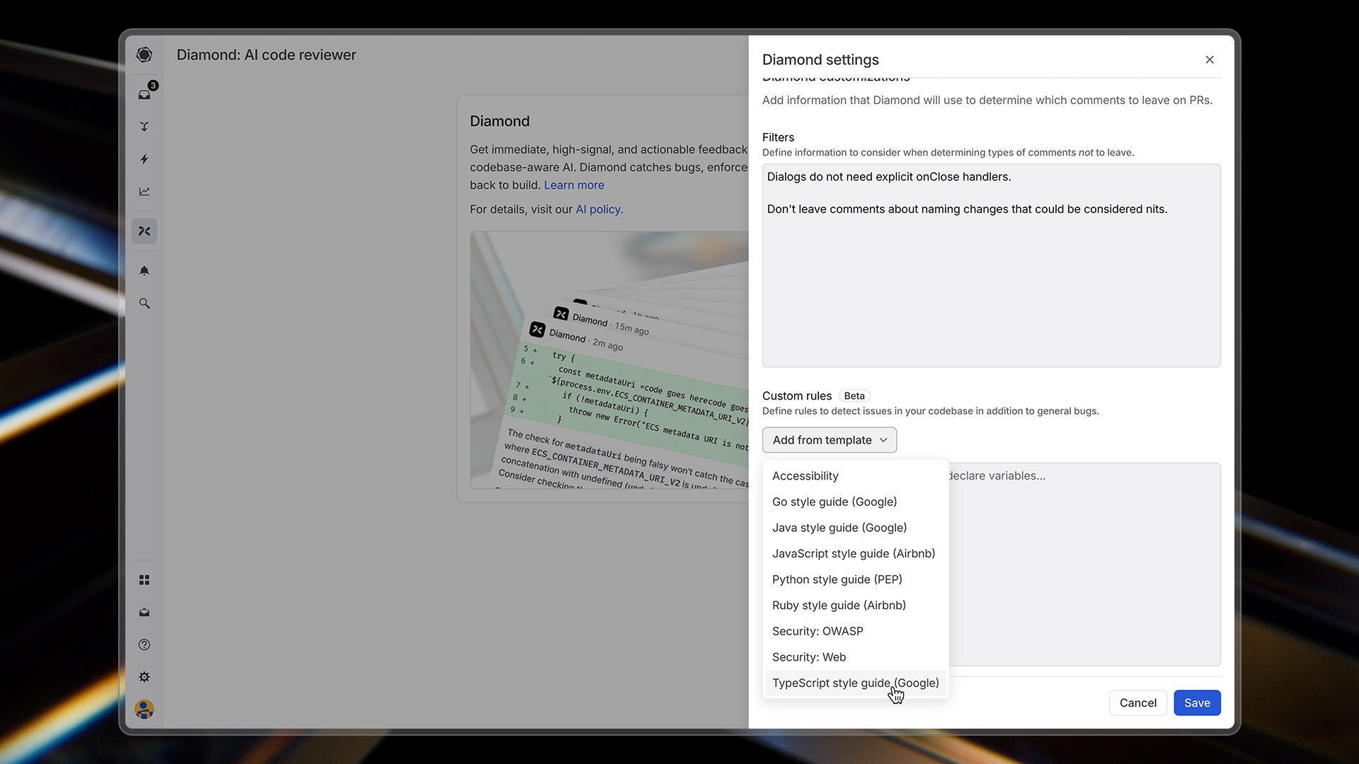 - Implement organization-specific review policies: Align Diamond’s behavior with your team’s development workflows and governance requirements