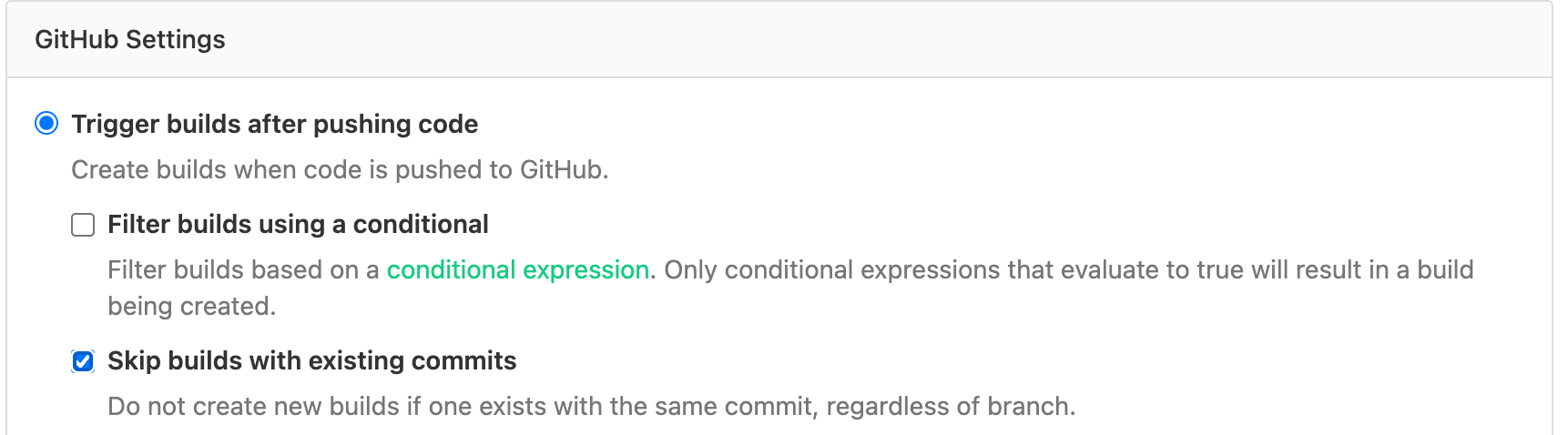 step in the pasted YAML so the CI optimizer pipeline can call your own pipeline after it decides whether to optimize CI for your PR. - In your own pipeline settings under GitHub > GitHub Settings, check the box Skip builds with existing commits. This ensures the Graphite optimizer pipeline runs first and conditionally triggers your existing pipelines.