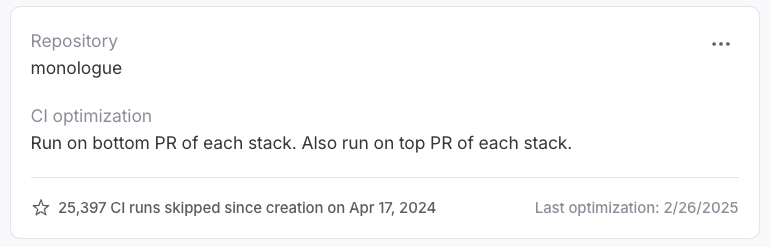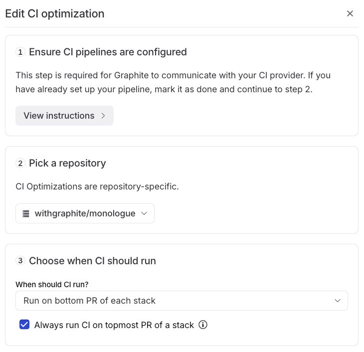 CI Optimizations is set up per-repository, and requires a very small amount of configuration, namely:- How many PRs at the bottom of each stack should run CI?