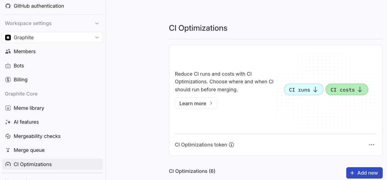 To begin setting up CI Optimizations, click the “Add new” button on its settings page on the Graphite dashboard.