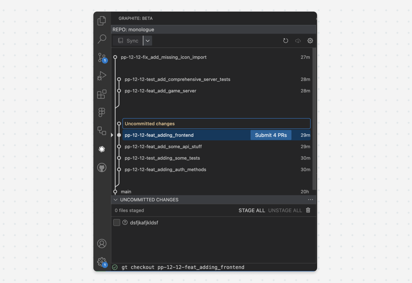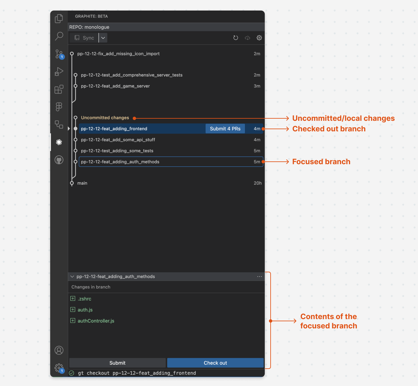 Uncommitted changes are represented by a node labeled “uncommitted changes” on the stack view. To see your uncommitted changes in the extension, focus the “uncommitted changes” node as you would any other branch. The branch info panel will adjust to a staging environment with your local changes.