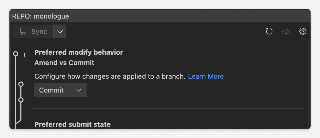When modifying a branch, you can either create a new commit on that branch, or modify the previous commit on that branch. You can set your preferred behavior in the extension’s settings: