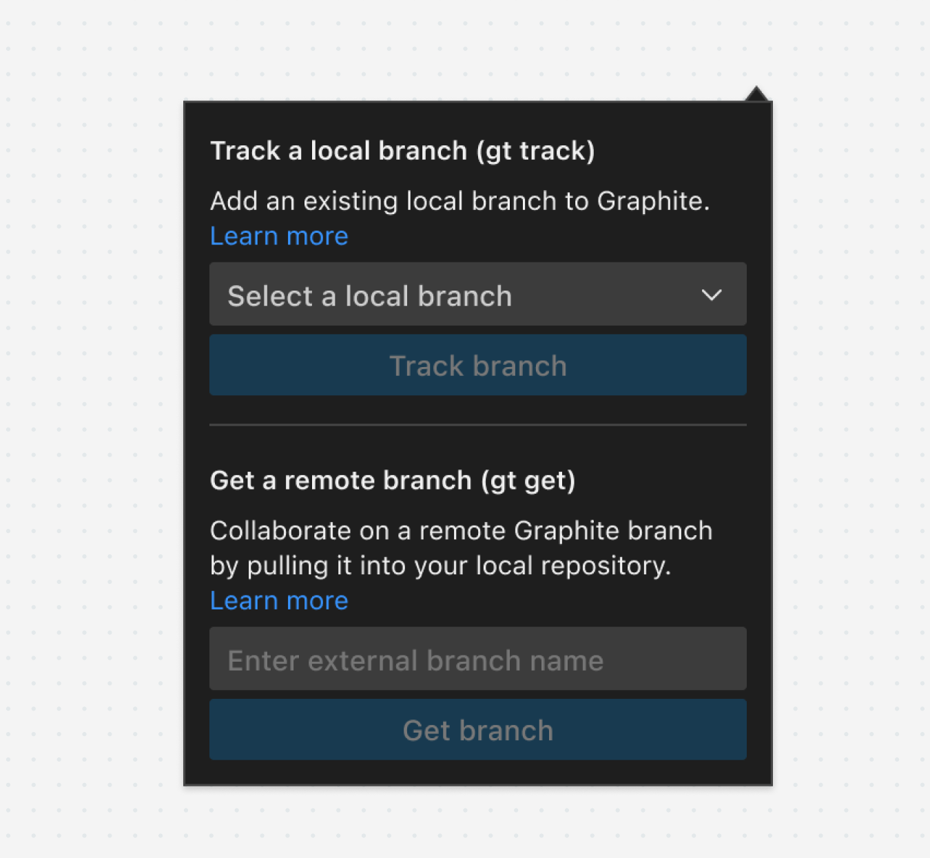 You can track branches onto a parent by clicking the “cloud” icon in the upper right hand corner of the extension. This is equivalent to the CLI’sgt track