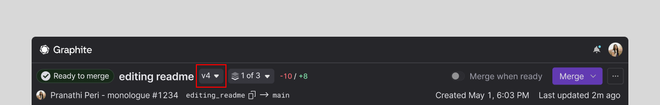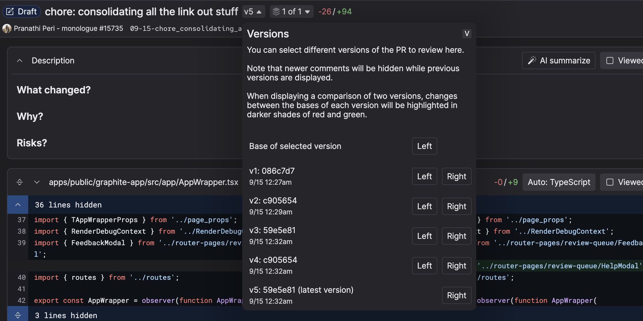 is the latest version of the PR. You can toggle between the version you’re currently viewing by clicking the versions dropdown and choosing a version for the “right” and “left” sides of the diff.